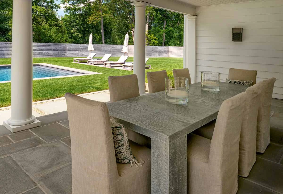 CUSTOM ALL WEATHER ZINC EXTERIOR TABLE, BURLAP CHAIRS